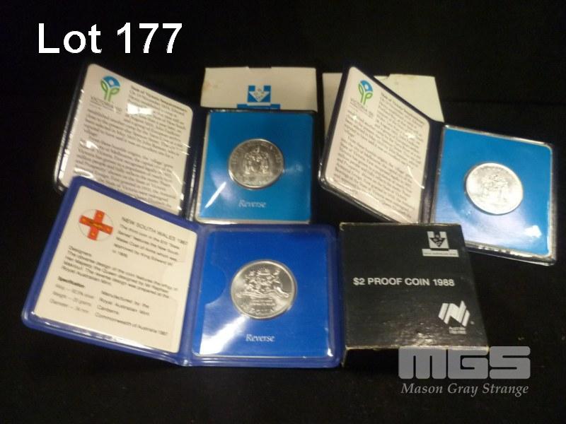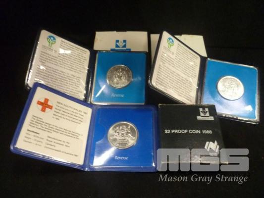 1988 SILVER 2 DOLLAR COIN, 2 X 1985 RAM STATE SERIES 10 DOLLAR COINS VICTORIA, 1987 NSW 10 DOLLAR COIN