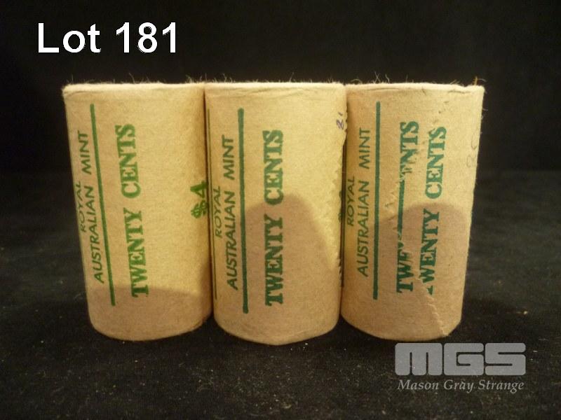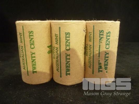 3 X ROYAL AUSTRALIAN MINT, UNCIRCULATED COIN BANK ROLLS, INC; 1980 X 20c, 1981 X 20c, 1982 X 20c