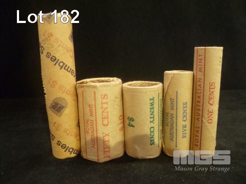 5 X ROYAL AUSTRALIAN MINT, UNCIRCULATED COIN BANK ROLLS, INC; 1977 X 1c, 1989 X 2c,1980 X 5c, 1980 X 20c, 1979 X 50c
