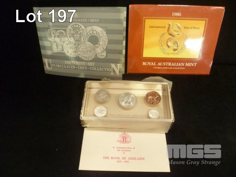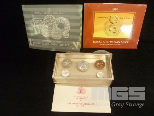 3 X COIN SETS THE BANK OF ADELAIDE CENTENARY SET IN ACRYLIC BLOCK 1865-1965 1987 MINT SET UNCIRCULATED COIN COLLECTION 1986 YEAR OF PEACE 1 DOLLAR COIN