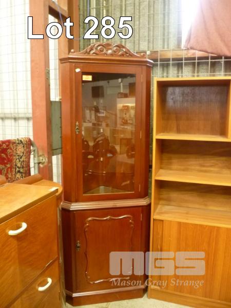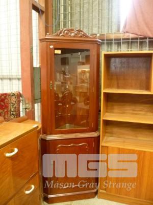 MAHOGANY CORNER DISPLAY CABINET, GLASS DOOR, 2 x GLASS SHELVES & SINGLE DOOR UNDERSTORAGE