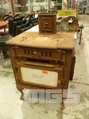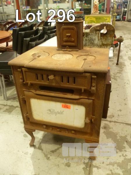 VINTAGE WOOD FIRE STOVE, 'THE RAPID', ENAMEL DOOR PANEL FRONTED WITH CIRCULAR INSERTS, NO FLU SECTIONS