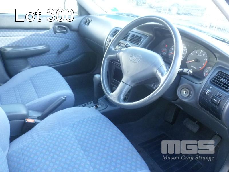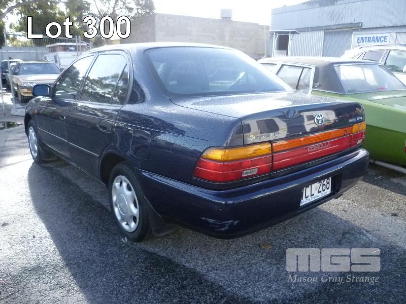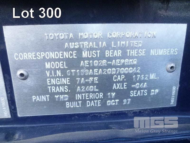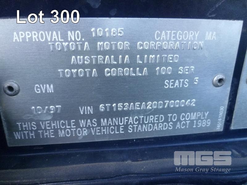 97 TOYOTA COROLLA CONQUEST SEDAN FWD REG: (SA) (EXPIRED) VIN: 6T153AEA20D700042 ENG: 7A9037929 ODO: 139349 PLANT NO: WCL268 1.8 LT, 3 SPEED AUTO, PETROL, BLUE, 4 DOORS, 5 SEAT, FWD CENTRAL LOCKING, IMMOBILISER, POWER STEERING, SPARE WHEEL (WITH PAPERS, WITH 2 KEY/S, WITH OWNER'S MANUAL, WITH SERVICE BOOKS)