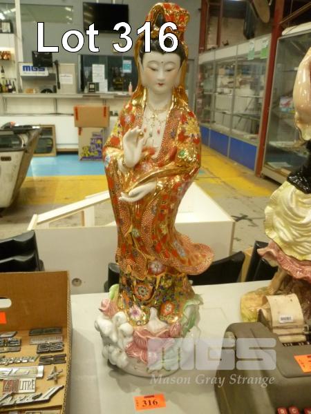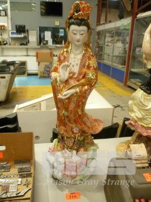 GLAZED CERAMIC STATUE, LADY PLAYING INSTRUMENT, 69cm (H)