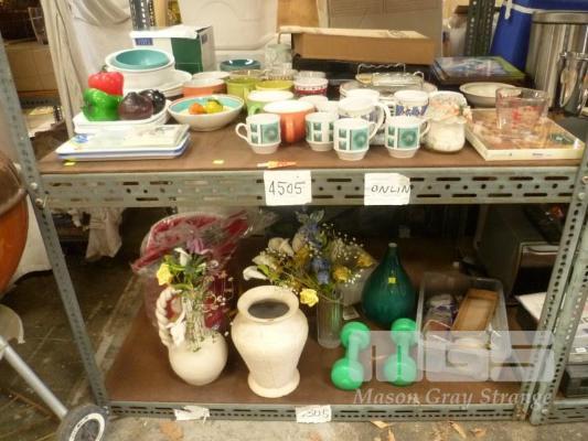 ASSORTED MUGS, PLATES, VASES, ETC, 2 x SHELVES