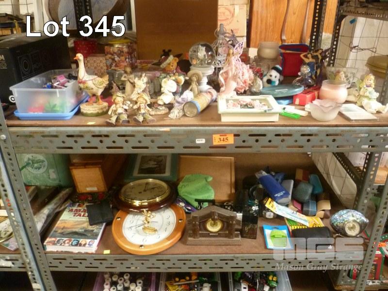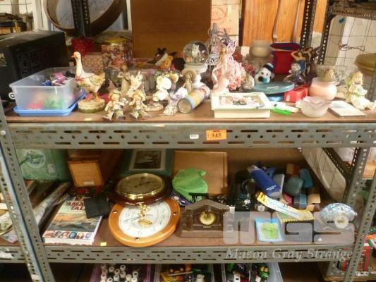 ASSORTED ORNAMENTS, FIGURINES, CLOCKS, ECT, 2 x SHELVES
