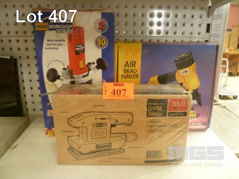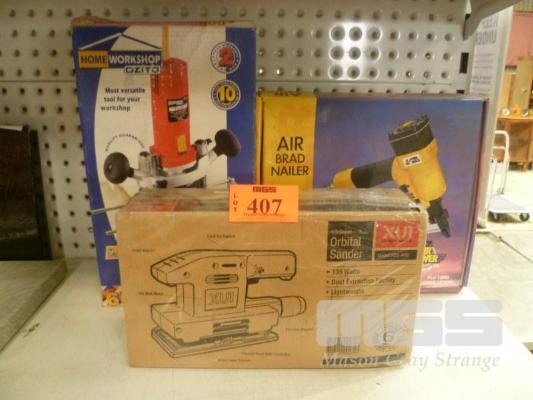 OZITO PLUNGE ROUTER, 6.35mm, XU1 ORBITAL SANDER & SUPERWORKS AIR BRAD NAILER