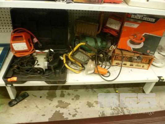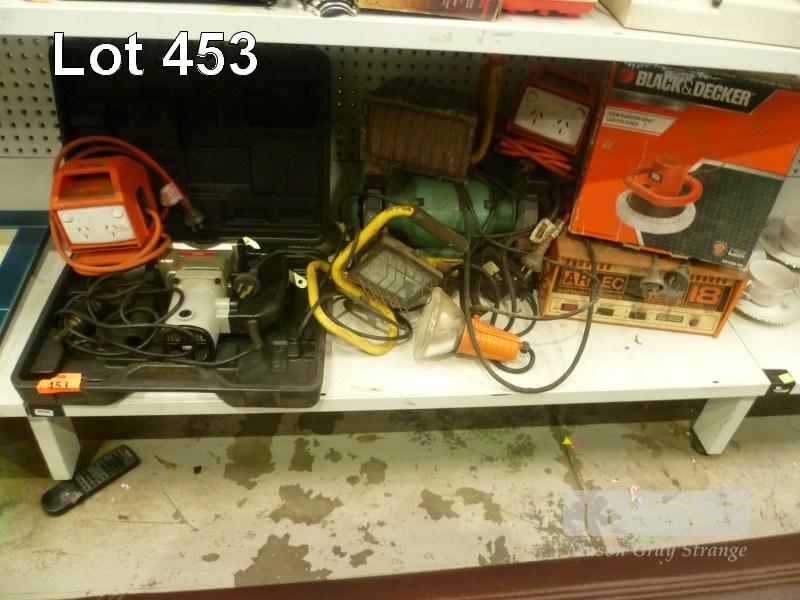 OZITO HAMMER DRILL, BENCH GRINDER, ARLEC BATTERY CHARGER, ORBITAL CAR POLISHER, LAMPS & POWER BOXES