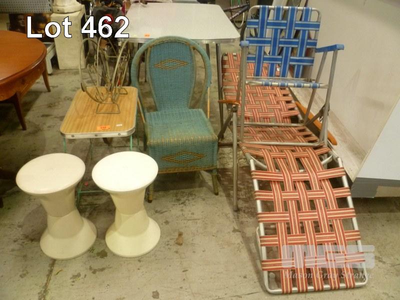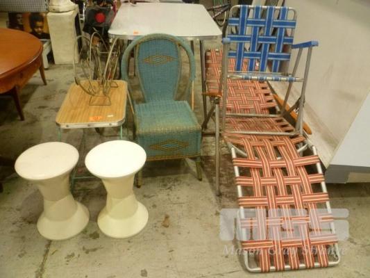 CANE CHAIR, MAGAZINE STAND, OCCASIONAL TABLE, 2 X STOOLS, SUN LOUNGE & OUTDOOR CHAIR