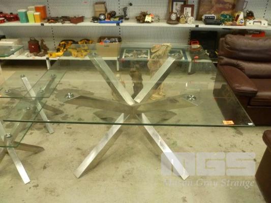 CONTEMPORARY SQUARE DINING TABLE, HEAVY GLASS TOP, STAINLESS STEEL LEGS