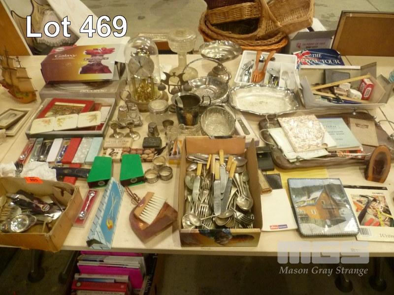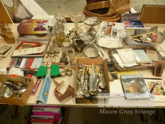 VINTAGE CUTLERY, SPOONS, EPNS, DOME CLOCK, STATIONERY ETC, 1 X TABLE