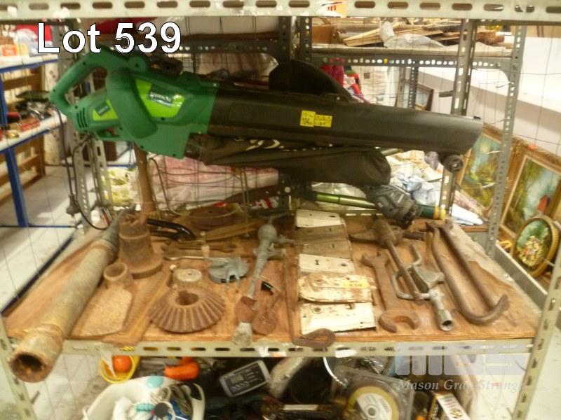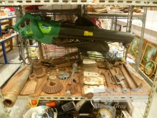 ASSORTED VINTAGE TOOLS, PARTS, DOOR LOCKS, ELECTRIC BLOWER/VAC & LINE TRIMMER