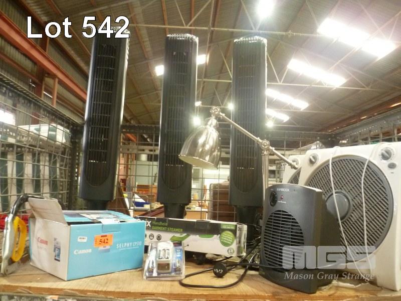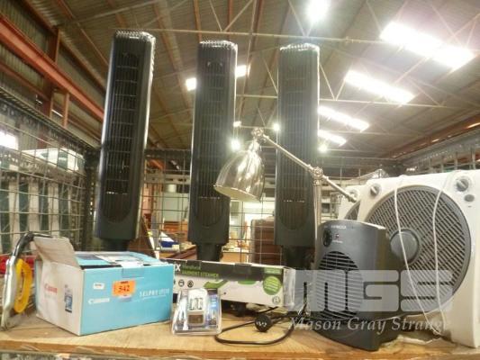 3 x VERTICAL FANS, 2 x PEDESTAL FANS, HEATER, TABLE LAMP, ETC