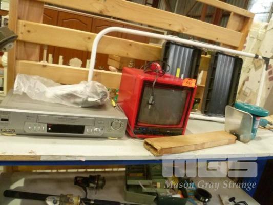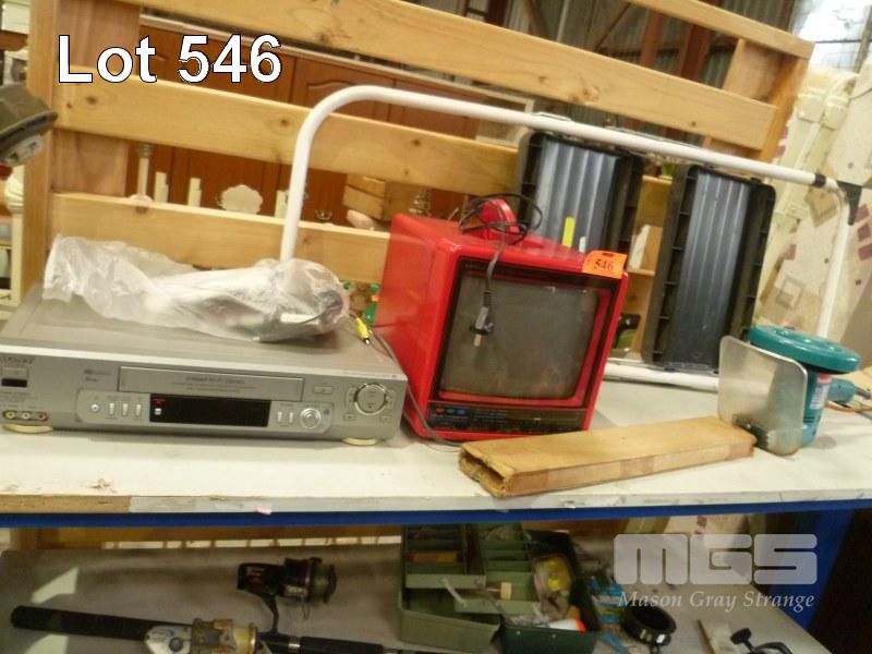RETRO, RED PORTABLE TV, SONY VCR (NO REMOTE), HEDGE TRIMMER & STEP LADDER