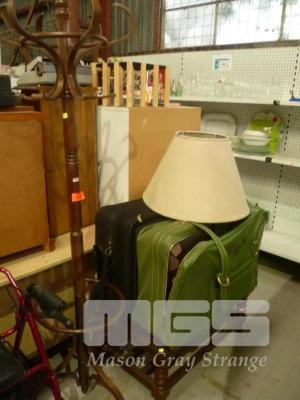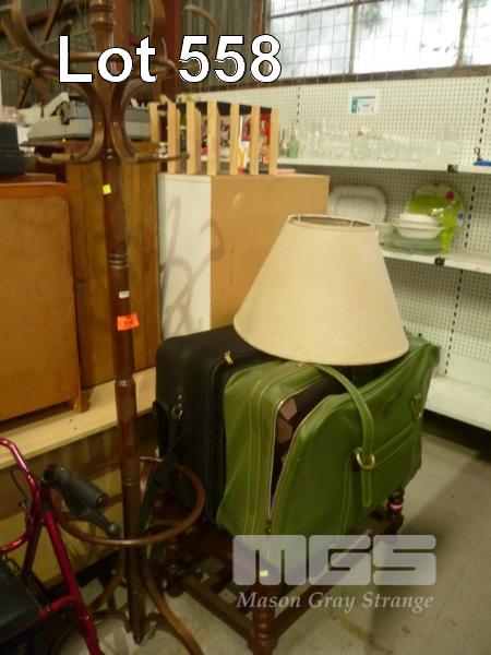 TIMBER CLOAK/HAT STAND, COFFEE TABLE & 2 x SUITCASES