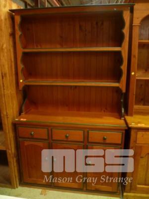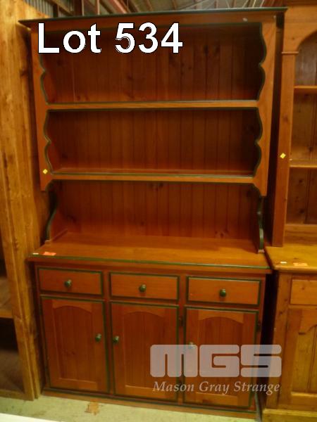 PINE KITCHEN CABINET, 3 DRAWER/DOOR, GREEN PAINTED TRIMMING