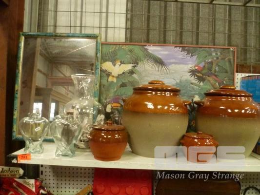 STONEWARE JARS, GLASS VASES, FRAMED PRINT & MIRROR