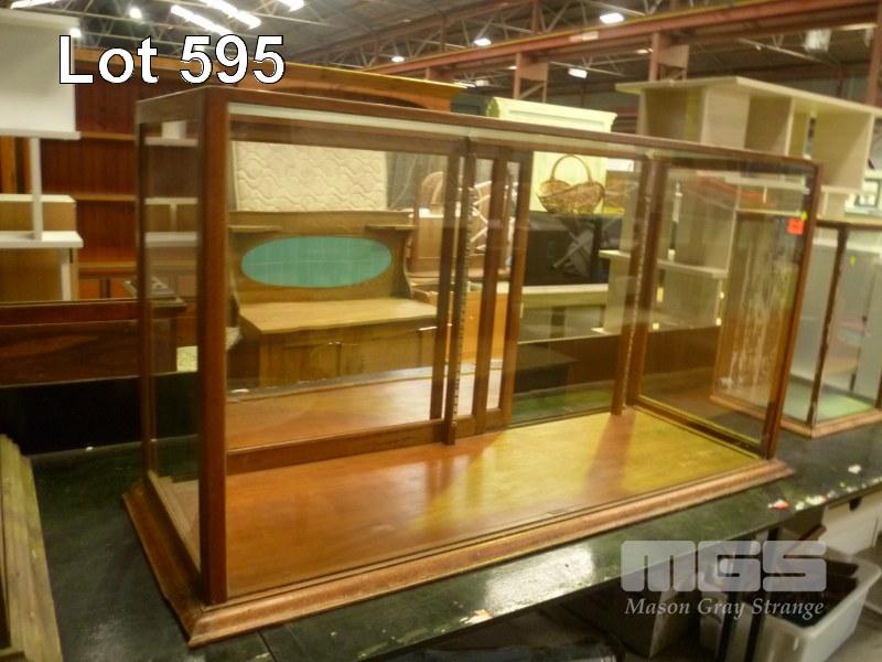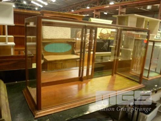 VINTAGE TIMBER GLASS DISPLAY CABINET, NO SHELVES, SLIDING MIRRORED REAR DOORS, (1 x MIRROR CRACKED), 155 x 52 x 80cm