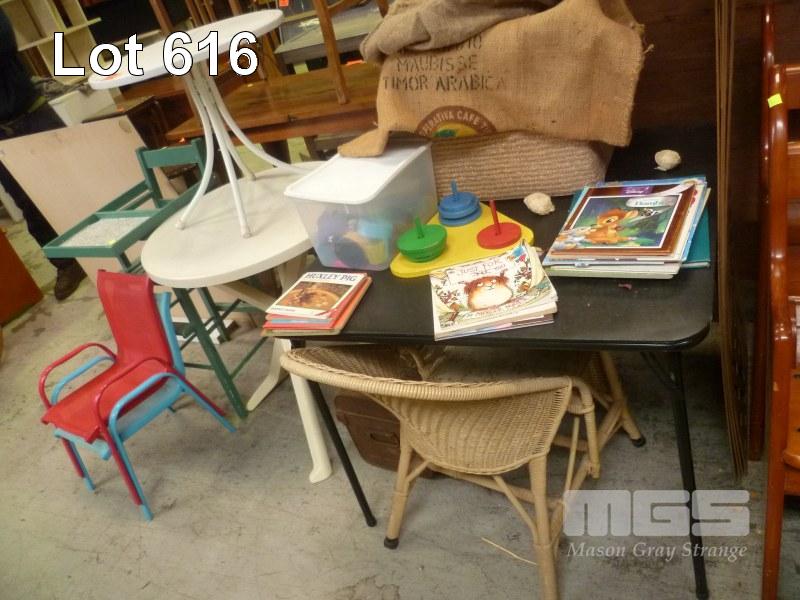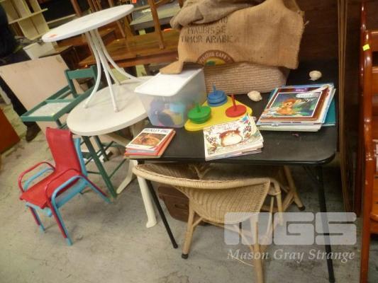 VINTAGE HIGH CHAIR, PAIR CHILDRENS CHAIRS, 2 x ROUND TABLES, CANE CAHIR, METAL TRUNK, ETC
