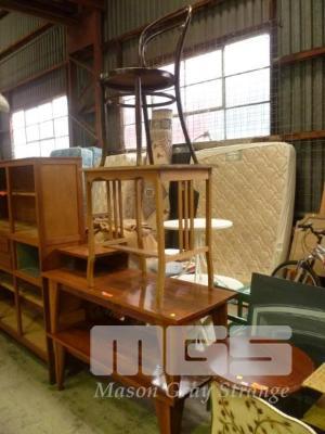 POLISHED TIMBER TELEPHONE TABLE, COFFEE TABLE, SIDE TABLE & BLACK PAINTED DINING CHAIR