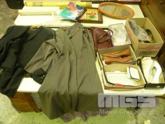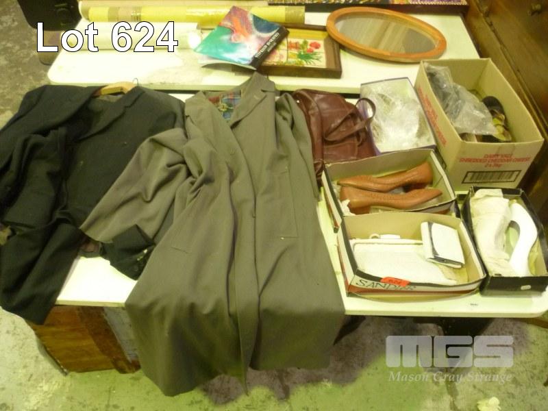 ASSORTED CLOTHING, MENS SUITS, OVERCOATS, LADIES SHOES, GLOMESH PURSES ETC