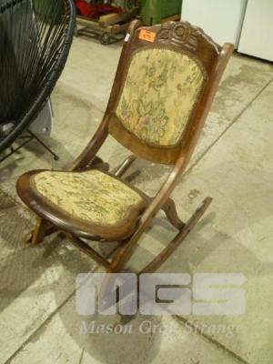 VINTAGE TIMBER ROCKING CHAIR, TAPESTRY UPHOLSTERED