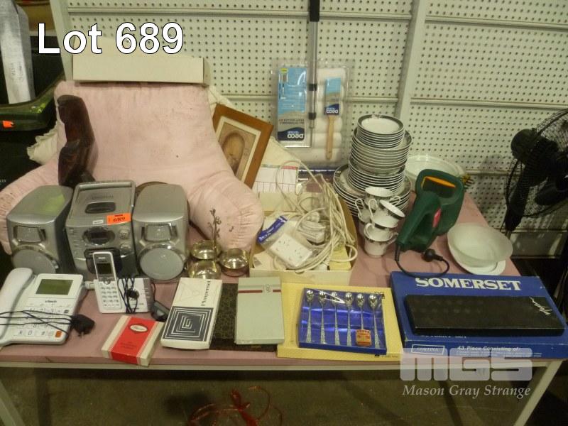 TEAC STEREO, TELEPHONES, BOXED CUTLERY, DINNERWARE, ETC, 1 x TABLE
