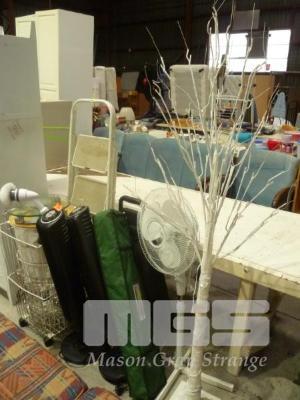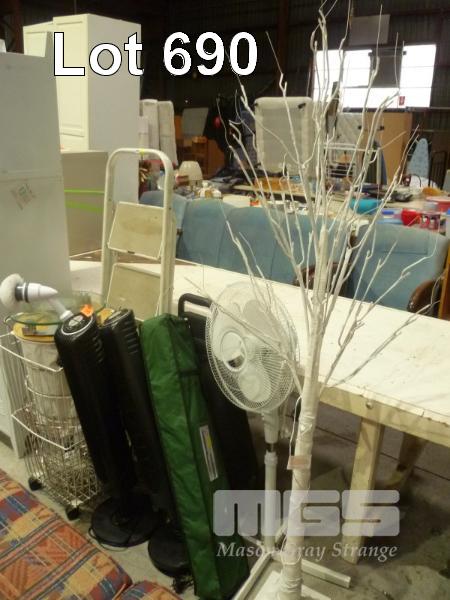 LED TREE, 2 x VERTICAL FANS, PEDESTAL FAN, CAMP BED, LAUNDRY BASKET, STEP LADDER & BATHROOM SCALES