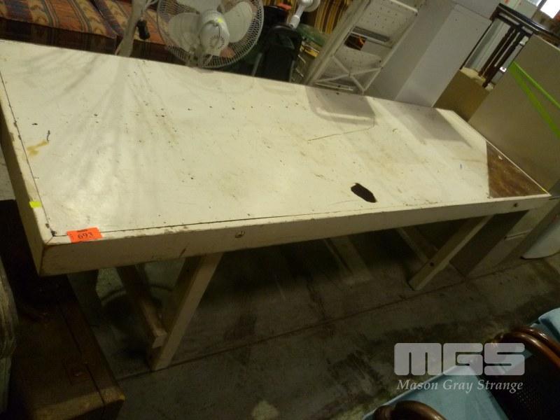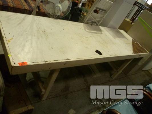 WHITE PAINTED TIMBER WORK BENCHM 250cm (L), (HOLE IN TOP)