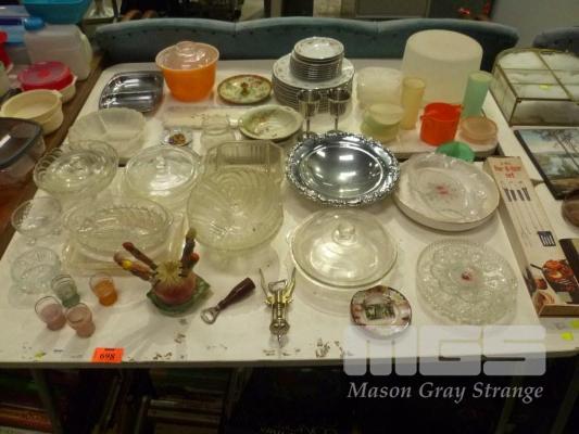 SERVING BOWLS, TRAYS, TUPPERWARE, 1 x TABLE