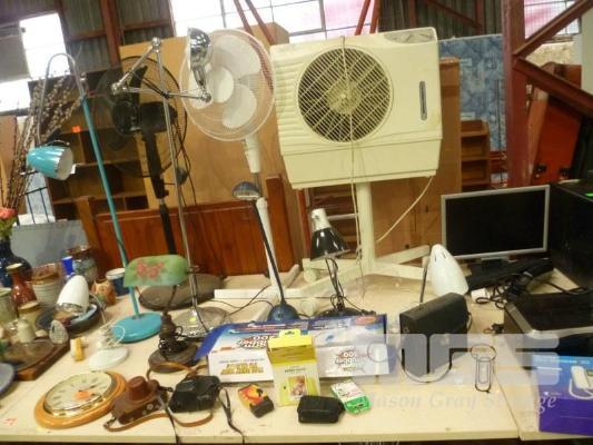 ASSORTED TABLE & STANDARD LAMPS, PEDESTAL FANS, EVAPORATIVE A/C & PHOTOGRAPHIC EQUIPMENT, 1 x TABLE