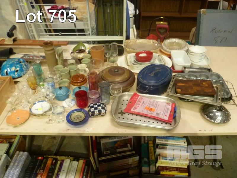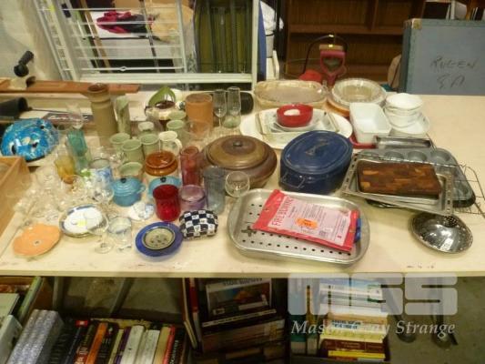 ASSORTED COOKWARE, MUGS, GLASSWARE, ETC, 1 x TABLE