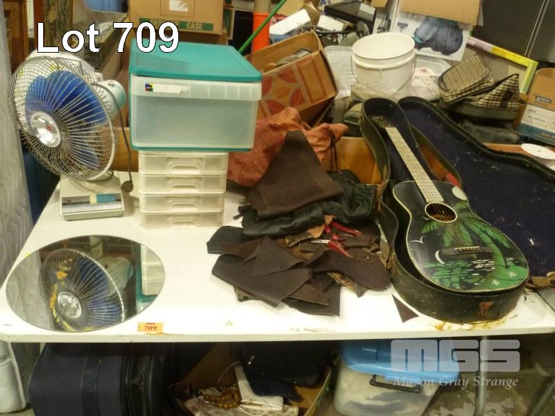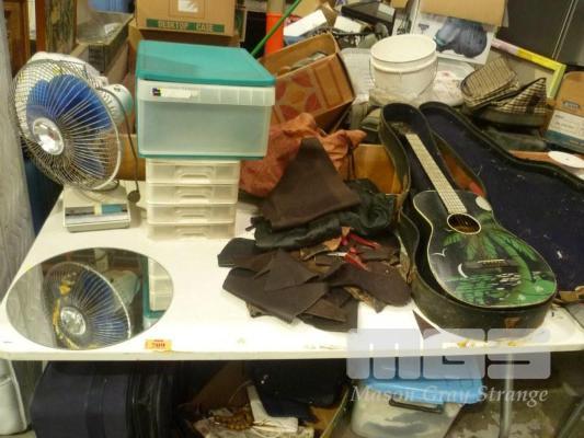 ASSORTED HOMEWARES INC VINTAGE GUITAR MADE IN U.S.A, FAN, LEATHER & MIRROR