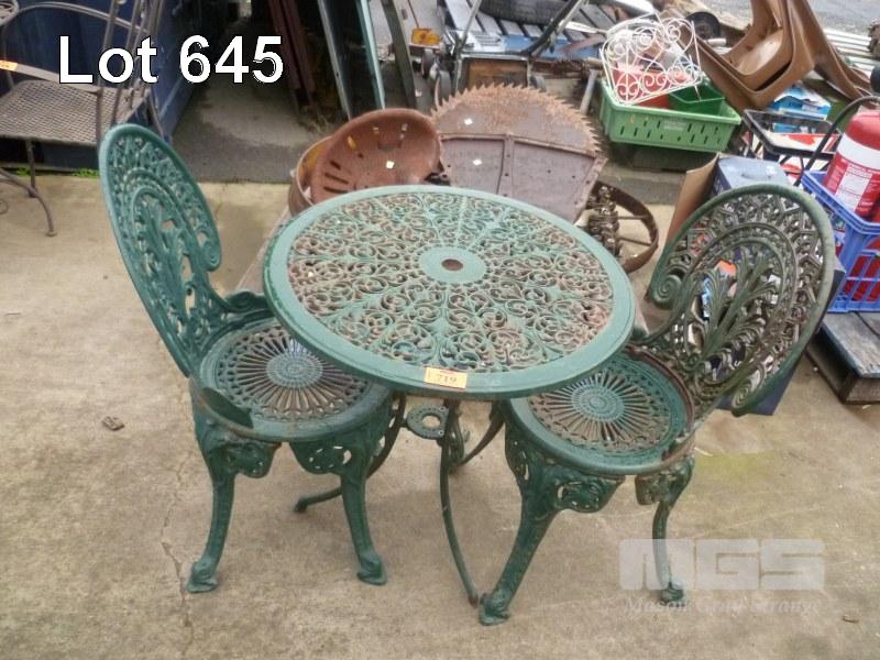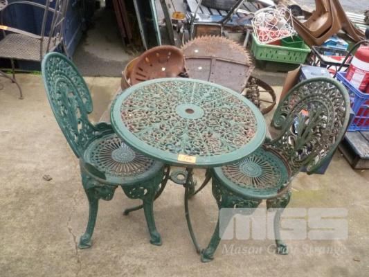 CAST IRON 3 PIECE PATIO SETTING, GREEN PAINTED, HEAVY CAST