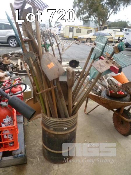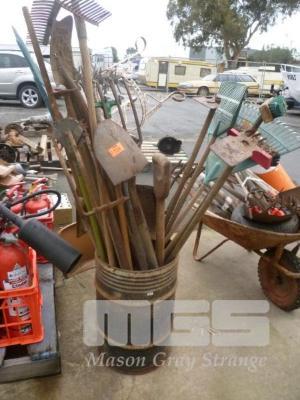 DRUM & CONTENTS, SHOVELS, RAKES, PITCH FORKS, ETC