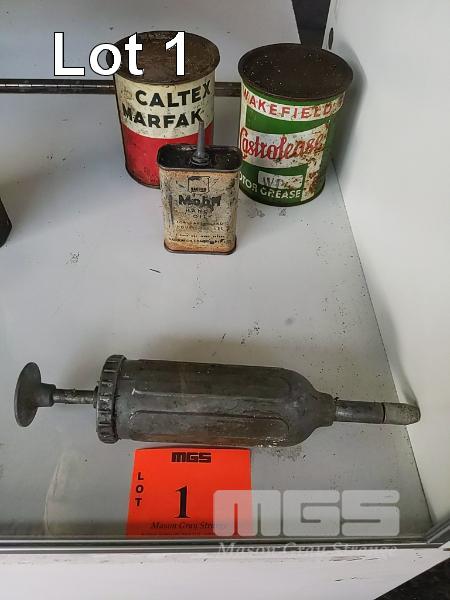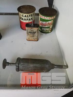 CASTROLEASE WAKEFIELD & CALTEX MARFAK 1 POUND GREASE TINS, MOBIL PEGASUS HANDY OILER & VINTAGE GREASE GUN