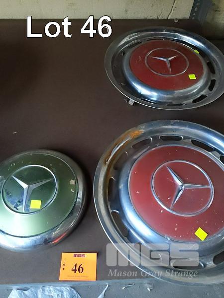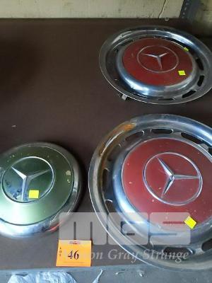 3 x ASSORTED MERCEDES HUB CAPS INC 2 x BURGUNDY & 1 x GREEN