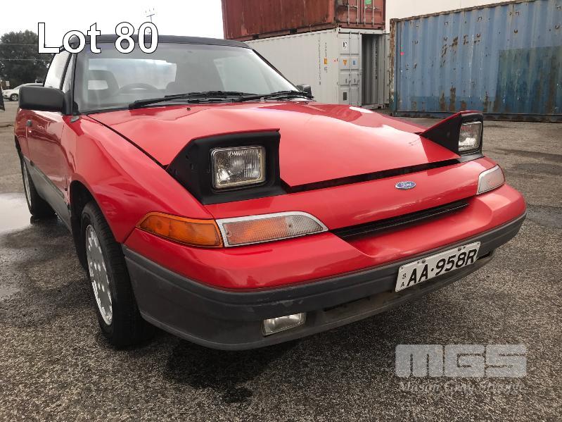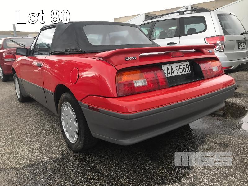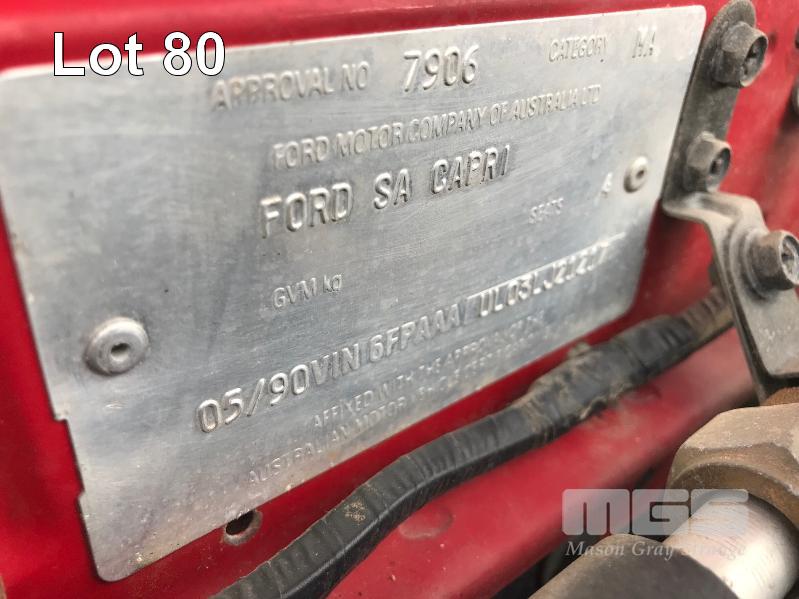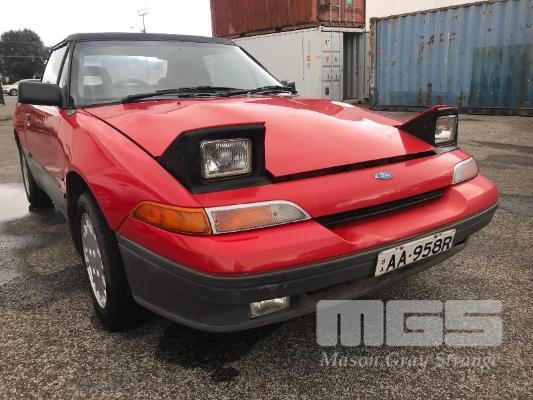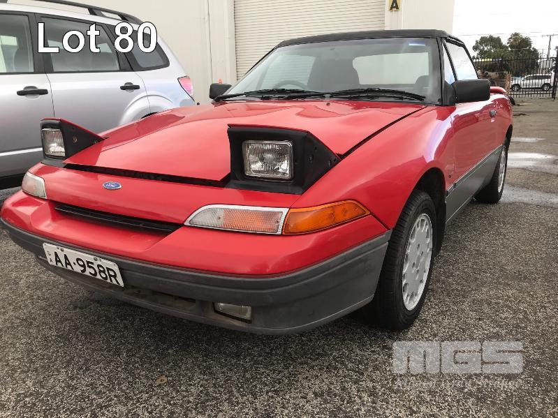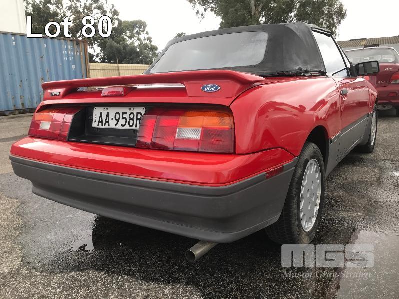 1990 FORD CAPRI CONVERTIBLE COUPE REG: AA 95 8R (SA) VIN: 6FPAAAUL03LJ21217 ODO: 144,682kms SHOWING 1.6 LITRE, 4 CYLINDER, 5 SPEED MANUAL TRANSMISSION, TURBO PETROL, RED DUCO, 2 DOORS, 4 SEAT, FWD AIR CON, ALLOY WHEELS, CD PLAYER, FOG LAMPS, POWER STEERING, POWER WINDOWS, KEY #53 (WITH 1 KEY/S) CONDITION: - VINYL ROOF DAMAGE - FADING DUCO & SCRATCHES