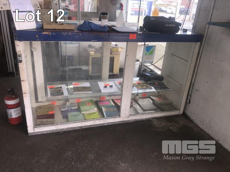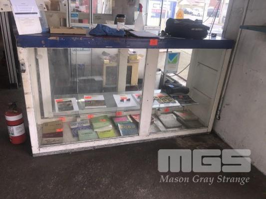 CLASSIC GLASS FRONT DISPLAY COUNTER, 2000 x 1100 x 600mm, WITH REAR GLASS SLIDING DOORS & SHELF