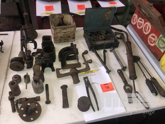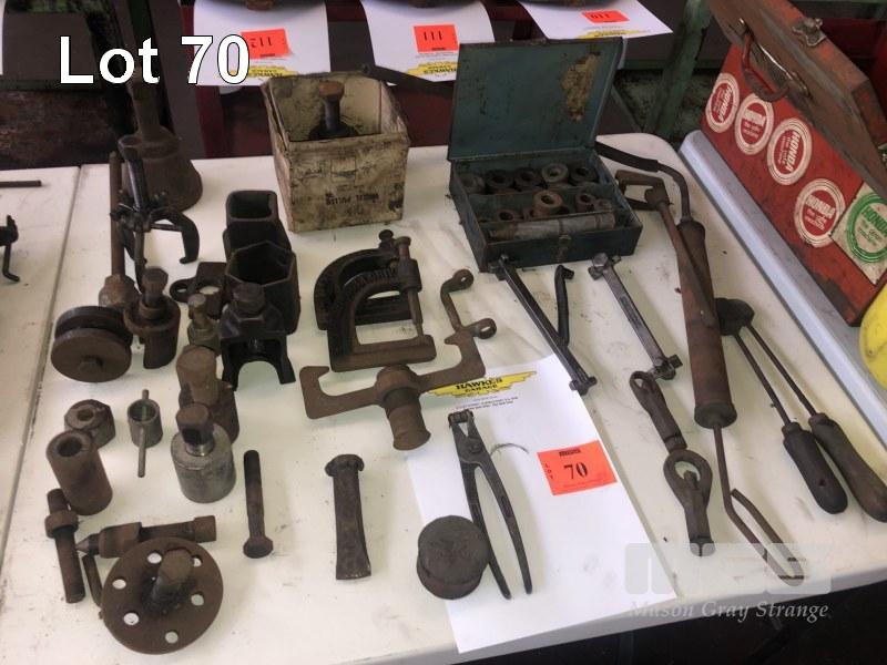 ANTIQUE AUTO TOOLING INCLUDING, SHOE RIVET, C SPANNERS, BREAKERS, PULLERS, PUNCH & IRONS