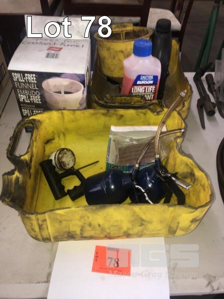 ASSORTED FUNNELS, TYRE REPAIR, OIL CANS & COOLANT