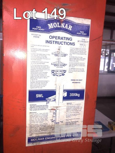 MOLNAR 2 POST FLOOR PLATE HOIST, 3000kg, MODEL: MF1705-85A-3T, SERIAL: MF1012, 415v