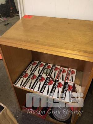 2 TIER TIMBER SHELF & CONTENTS, MAGNIFYING GLASSES