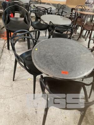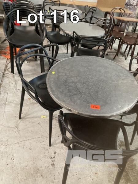 3 x ALUMINIUM TABLES, 70cm DIAMETER & 9 x SPAGHETTI BACK, BLACK PVC CHAIRS
