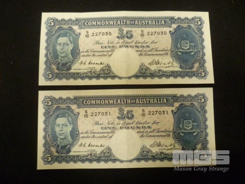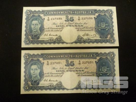 1949 2 x 5 POUND NOTES CONSECUTIVE COOMBS WATT APPEAR HIGH GRADE