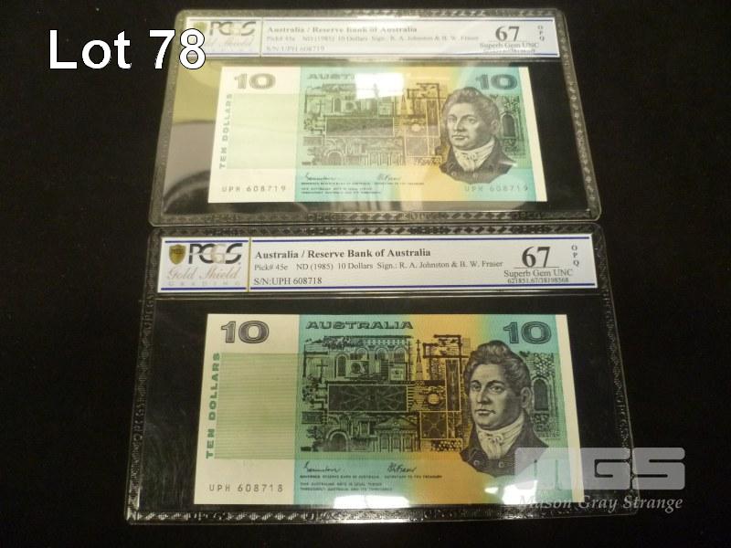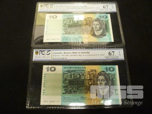 1985 2 x $10.00 NOTE CONSECUTIVE GRADED SUPERB GEM 67 FRAZER JOHNSTON