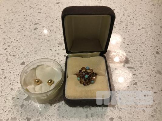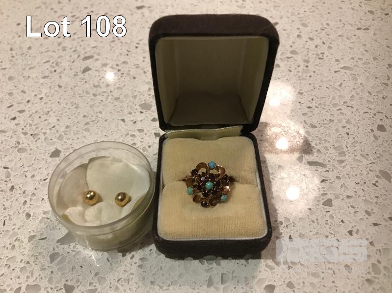 VINTAGE FLORAL GOLD RING SET WITH 8 X RED STONES, 4 X AQUA ORBS, 14CT, 3.9 GRAMS & PAIR OF EARRINGS, 9CT, 1.3 GMS