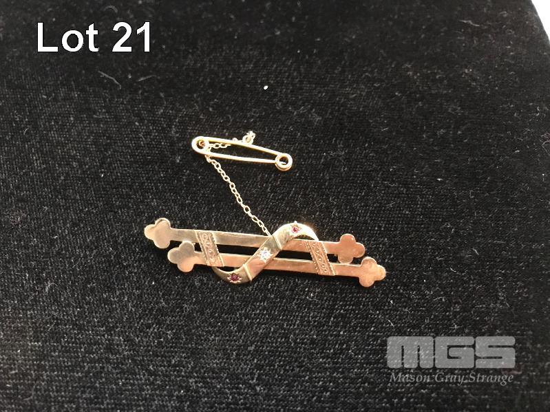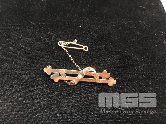 GOLD DOUBLE BAR SHAPED BROOCH, SET WITH 1 CLEAR & 2 RED STONES, MARKED 375, 3.3 GMS