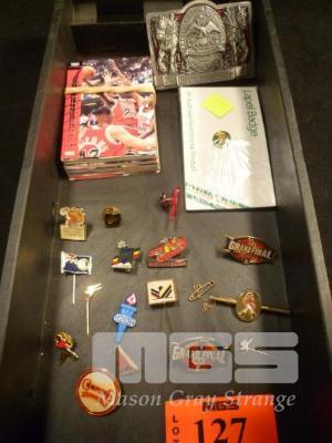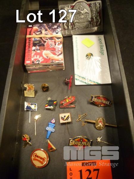 CIRCA 1990'S NBL COLLECTOR CARDS, BUDWEISER BELT BUCKLE & ASSORTED BADGES & PINS