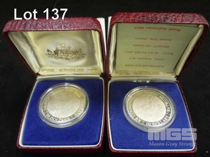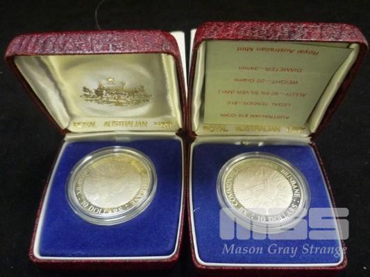 2 X 1982, ROYAL AUSTRALIAN MINT, $10 SILVER PROOF COINS, XII COMMONWEALTH GAMES BRISBANE